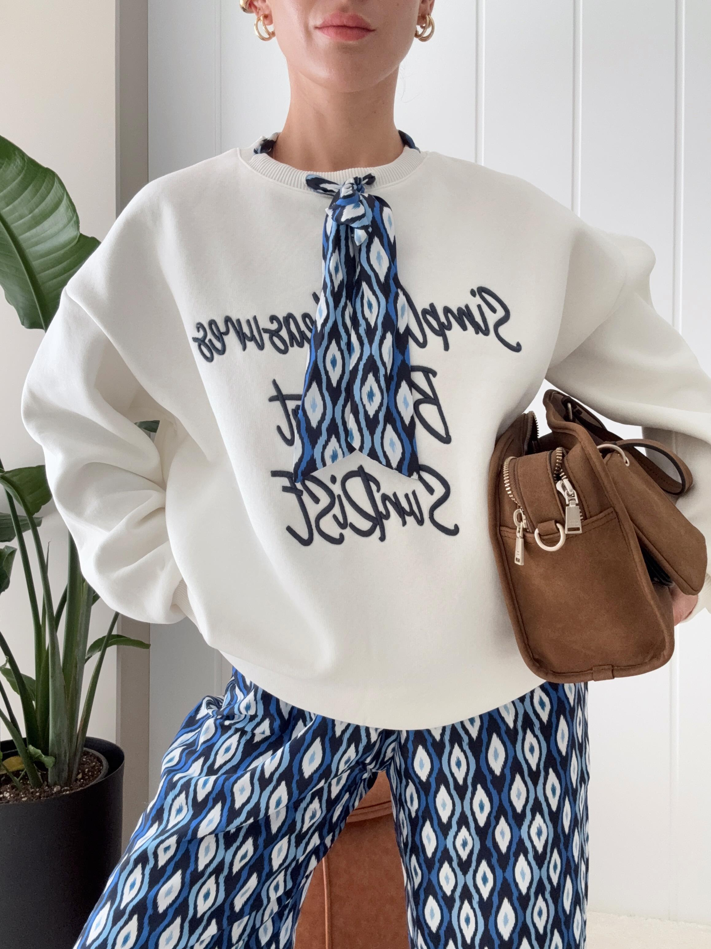 Desen Fularlı Baskılı Oversize Sweat Ekru