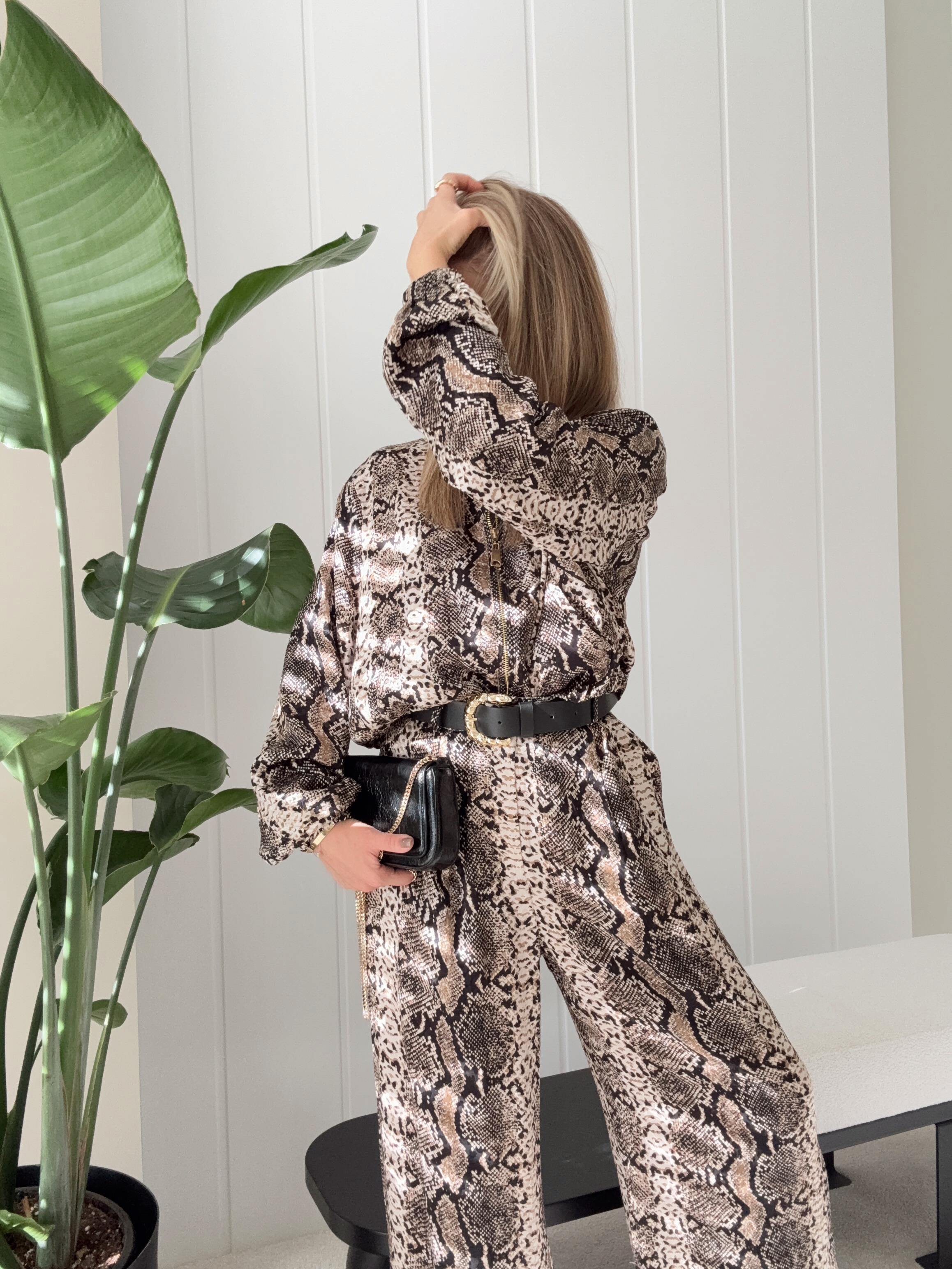 Gold Toka Detaylı Kemerli Saten Pantolon ve Bomber Ceket Takım Leopar