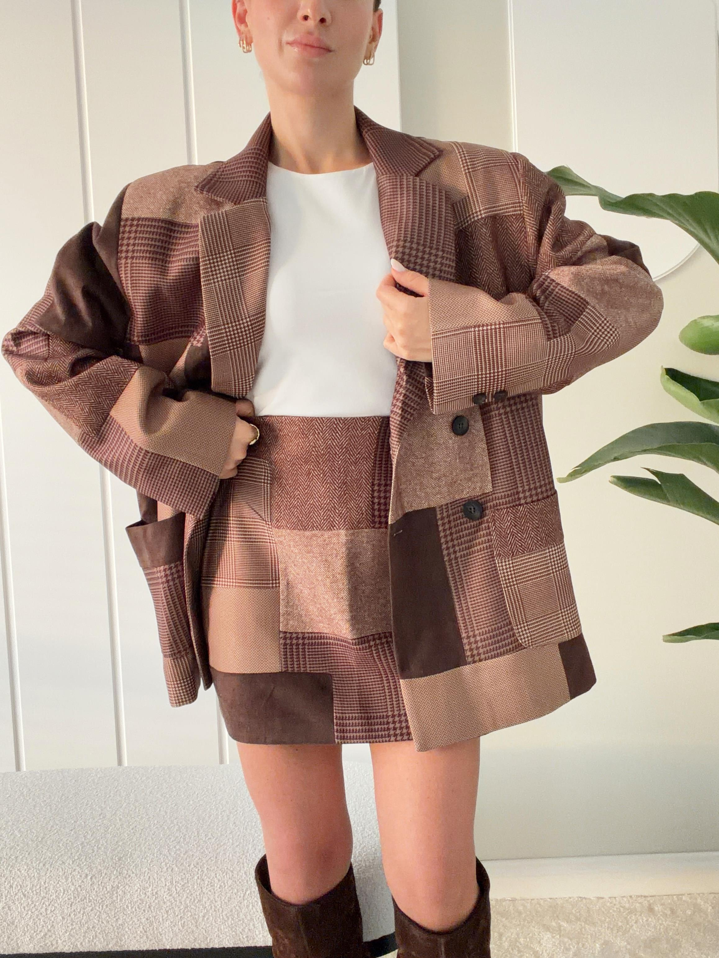 Patchwork Kruvaze Blazer Ceket Kahverengi